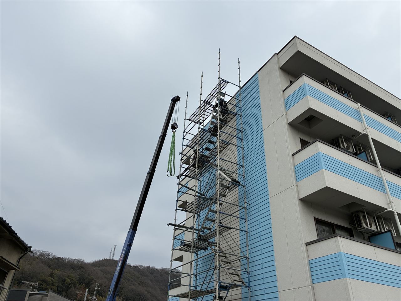 福山市内にある、地上4階建てのアパートの屋上防水工事を行うべく、