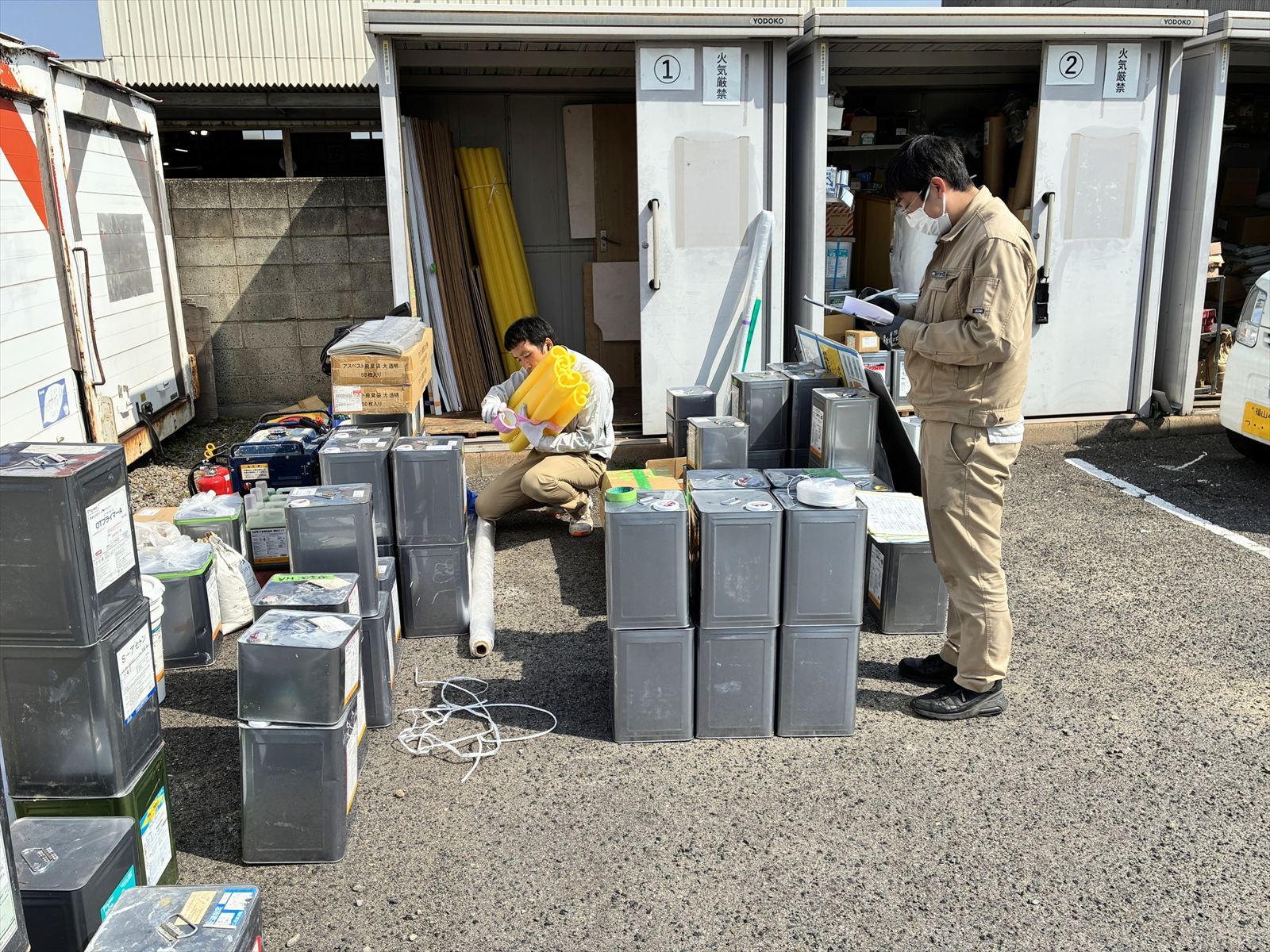 駐車場には倉庫が3つあり、見た目はさほどに大きくありませんが、一つひとつに多種の資材が保管されているため、出し入れだけでも大変だと思います。